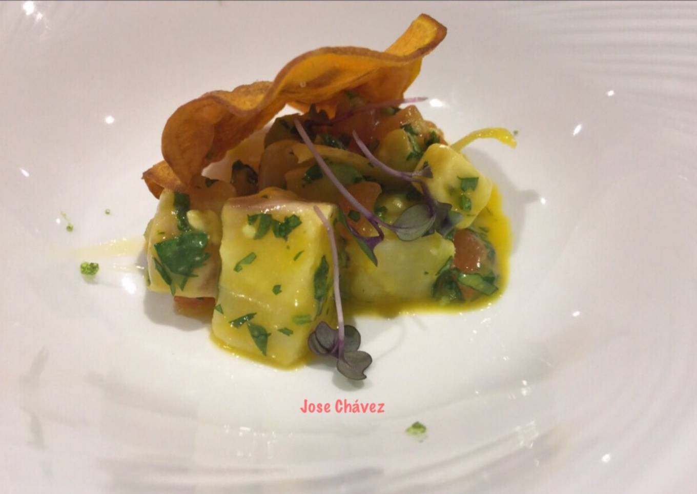 - En la base de un plato ponemos ceviche, un poco de ralladura de lima y 1-2 chips de batata.