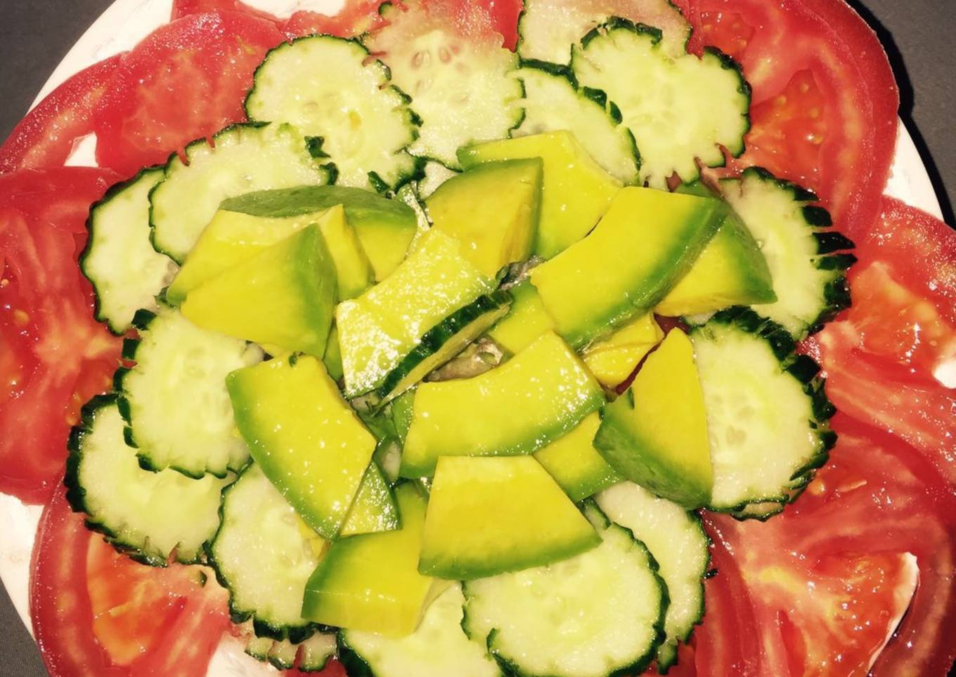 Una ensalada sencilla y saludable de tomate, pepino y aguacate.