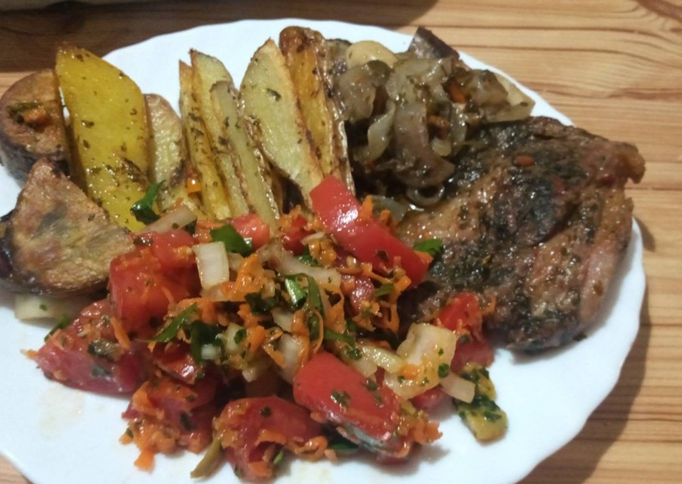As for the number of servings that can be served to make Carne al horno con papas y batatas con salsa schug is 2 porciones. So make sure this portion is enough to serve for yourself and your beloved family.