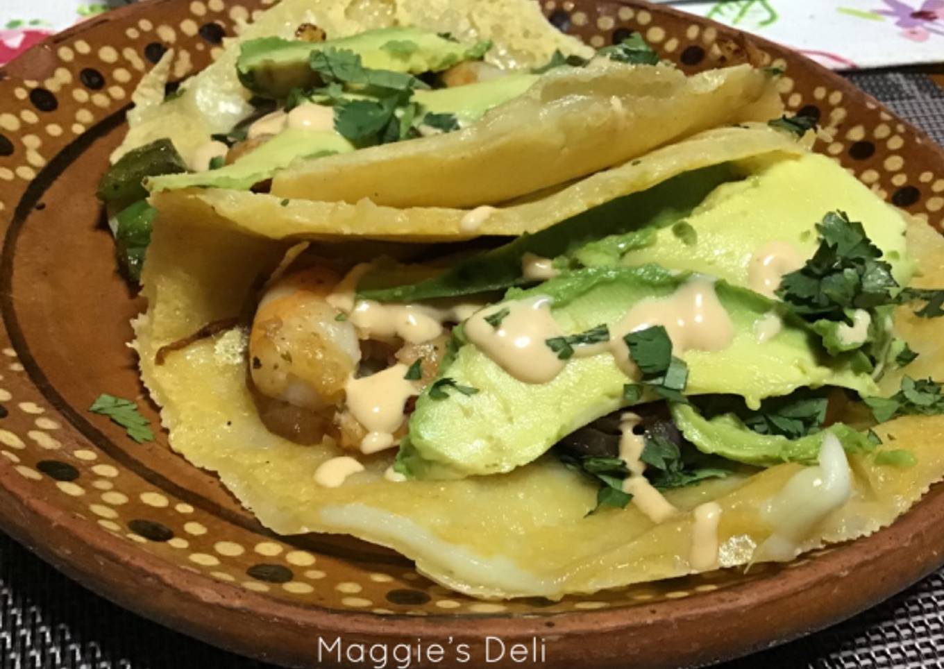 Taco de chicharrón de queso relleno de camarón , cebolla , chile jalapeño, cilantro, aguacate y salsa amarilla