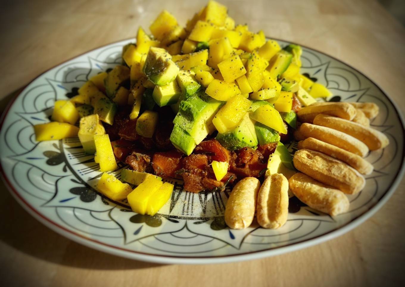 - Antes de montar el plato, cortamos en cubitos los aguacates y el mango.