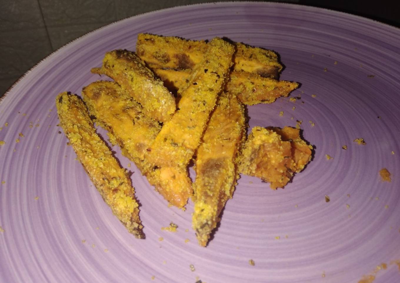 - Pelar y lavar bien la batata. Cortar en bastones gruesos. Llevar a bandeja para horno. Le añadimos los condimentos, el aceite de oliva, sal a gusto, los ajos rallados y la polenta. Mezclamos bien con la mano y luego los esparcimos bien por toda la bandeja para que no queden todos pegados y se pongan crocantes