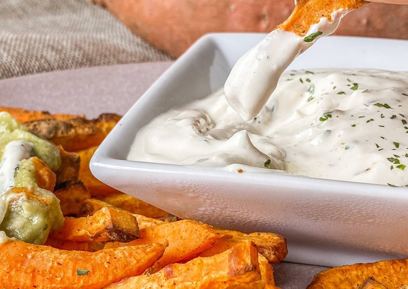 Batatas "fritas" con salsa de yogur y mostaza