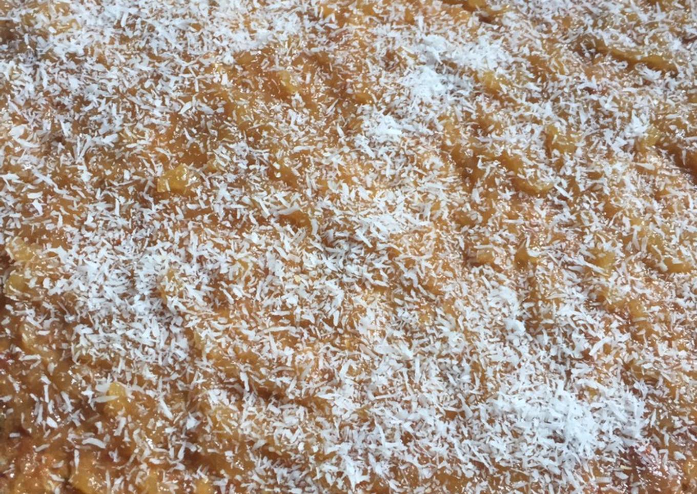- Hacer un puré con el dulce de batata y cubrir la masa cocinada. Meter al horno por tres minutos y retirar. Espolvorear con el coco rallado y dejar enfriar.