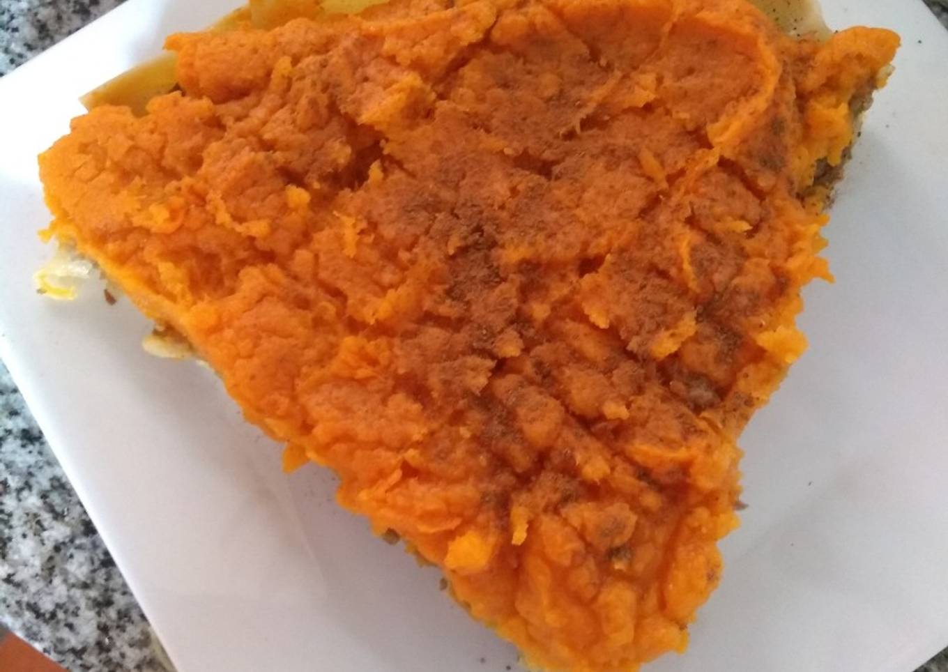 - Estirar la masa de tarta en una fuente para horno y colocar la carne ya cocida mezclada con 1 huevo, (yo le puse una capa fetas de queso), y arriba el puré, (opcional espolvorear canela sobre el puré).