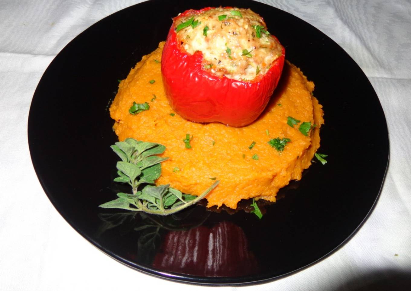 PIMIENTOS MORRONES RELLENOS CON POLLO SOBRE PURÉ DE CAMOTE AMARILLO. JON STYLE