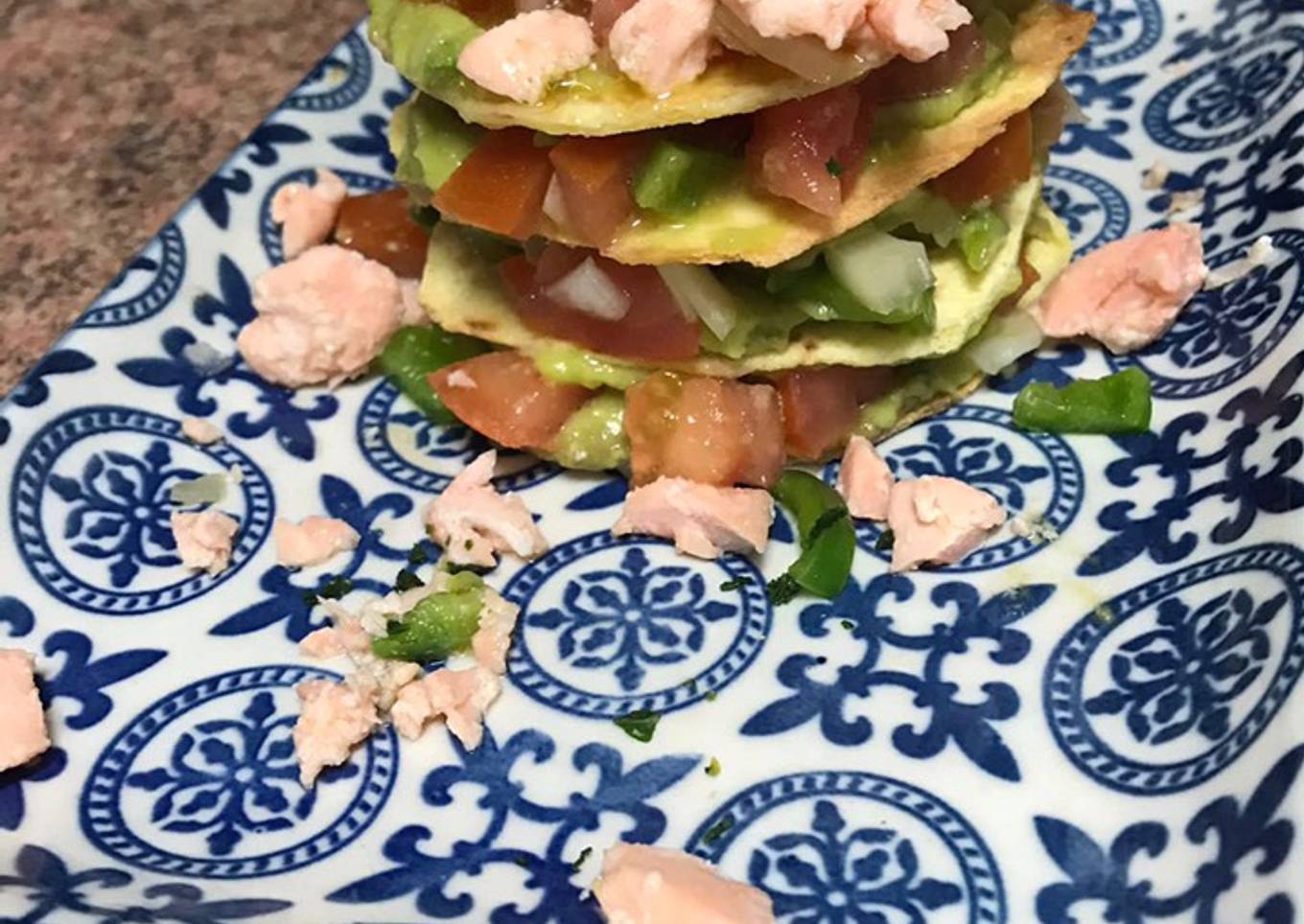 - Para montar el tartar, cogemos una de nuestras tortitas cortadas y tostadas previamente, la untamos con el aguacate molido y le ponemos picadillo. Otra tortita encima de la misma manera y as铆 hasta que lleguemos a la 煤ltima tortita, en la que pondremos el salm贸n encima.