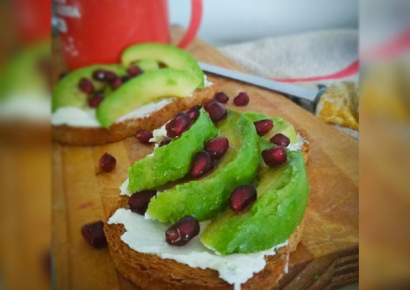 - Untar la tostada con el queso, poner el aguacate encima y los granos de granada. Buen provecho!!!