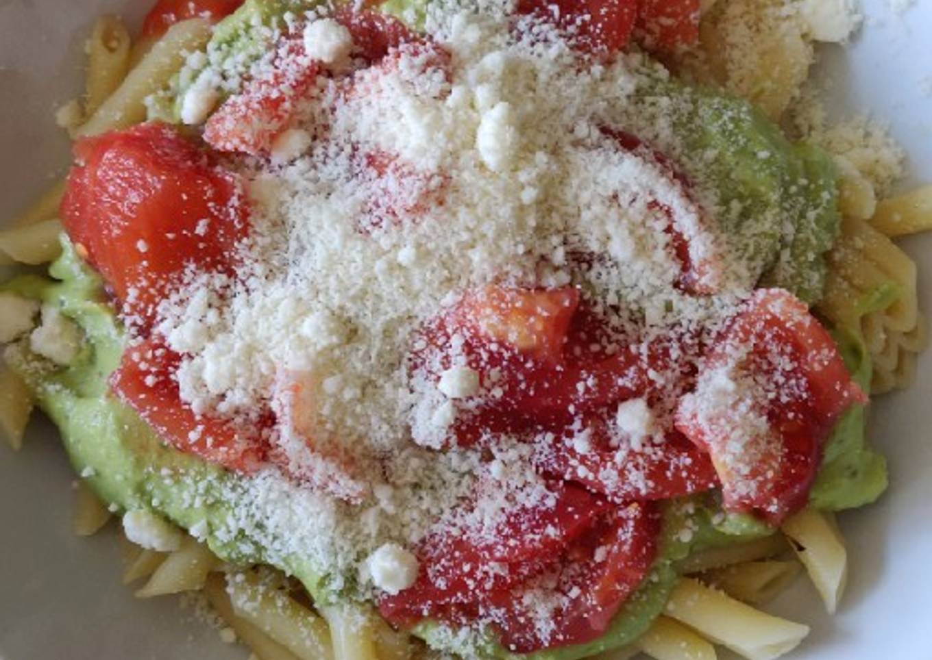 - Servir los macarrones en un plato. Echar el tomate cortado y la salsa de aguacate por encima.
