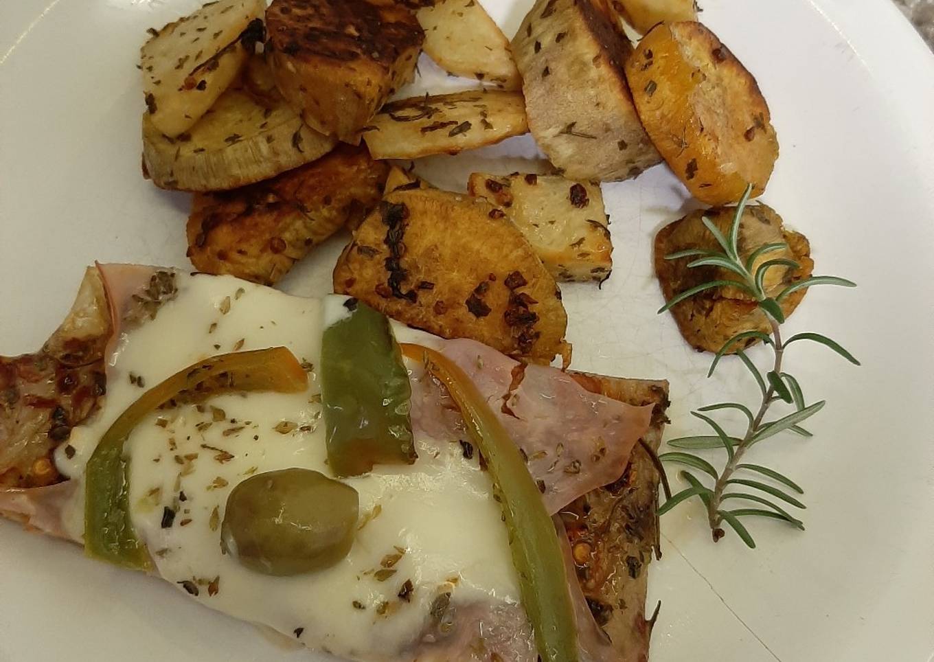 - Papa y batata cortadas y condimentadas con aceite de oliva (40 min horno)