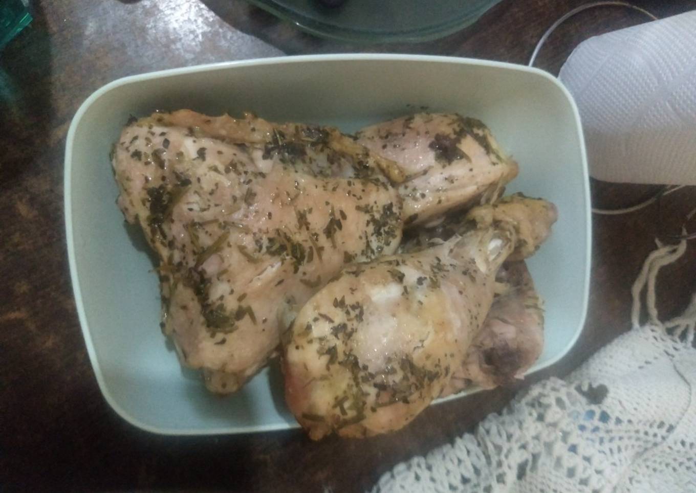 - Mi pollo asado consistió en, tres patas y dos muslos, debido a su tamaño. Vos podés usar la cantidad que desees. Lo primero, hay que quitar la grasa, para luego salar y condimentar a gusto (Utilicé orégano, provenzal, estragón, romero y laurel triturado).