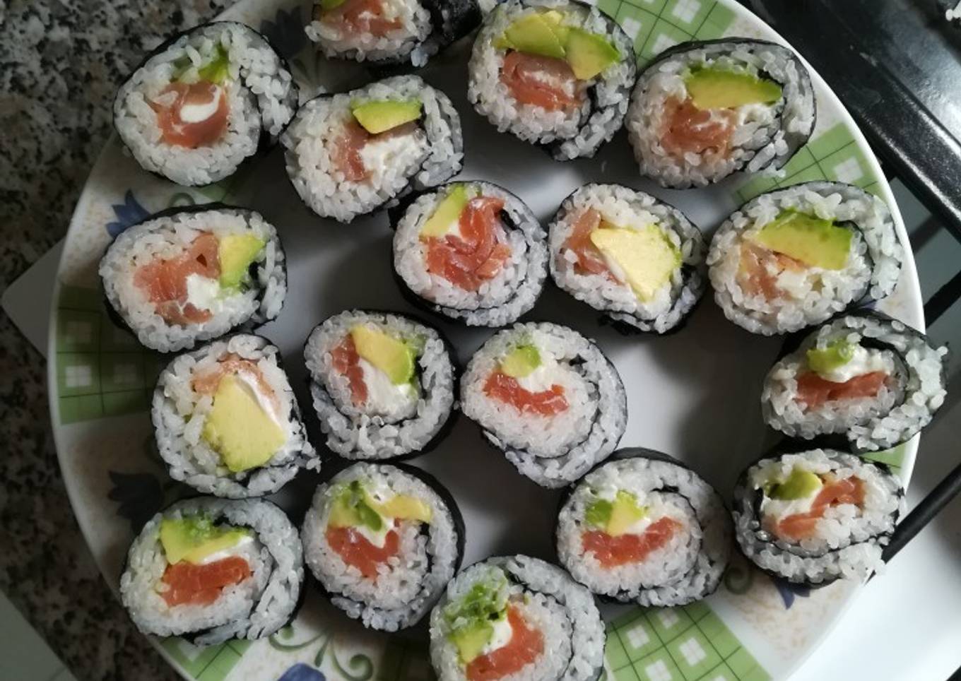 Sushi con salmón, aguacate y Philadelphia