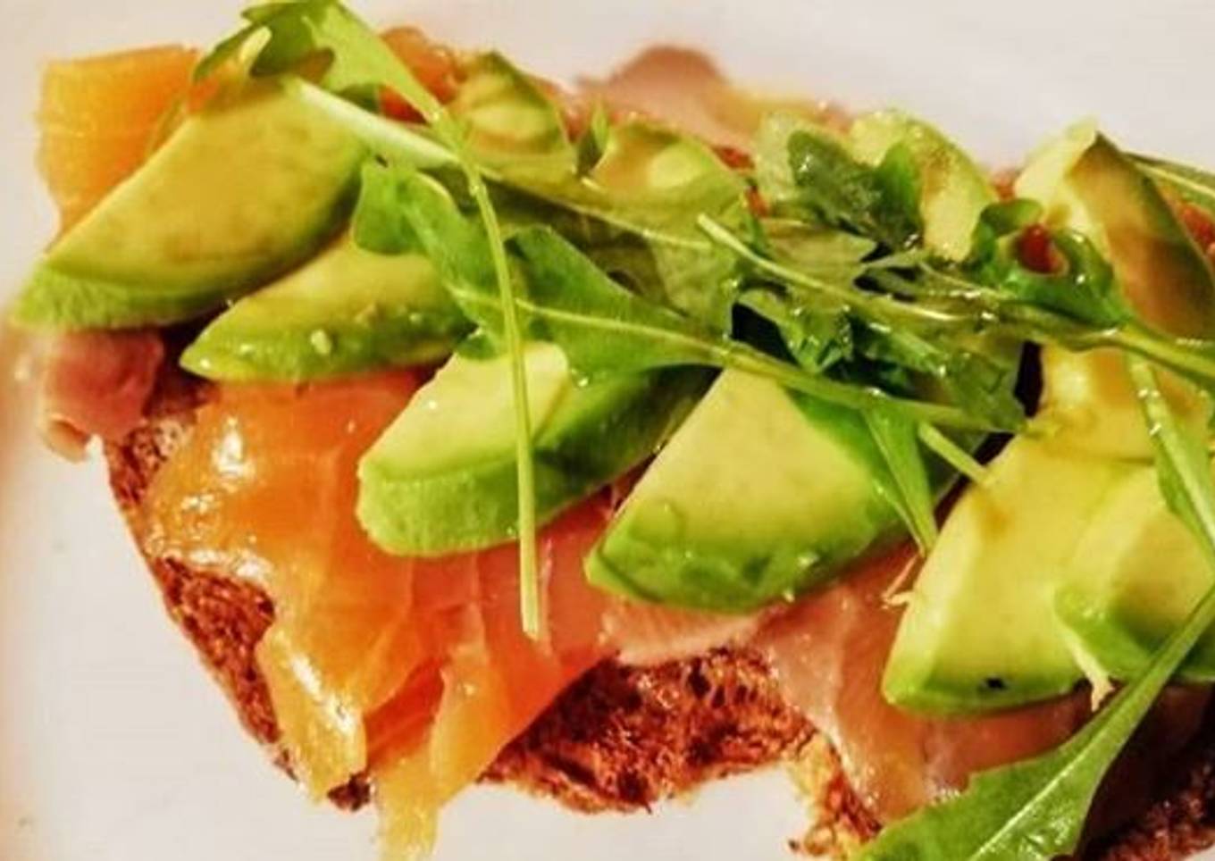 Tostada de salmón, aguacate, queso fresco y rúcula