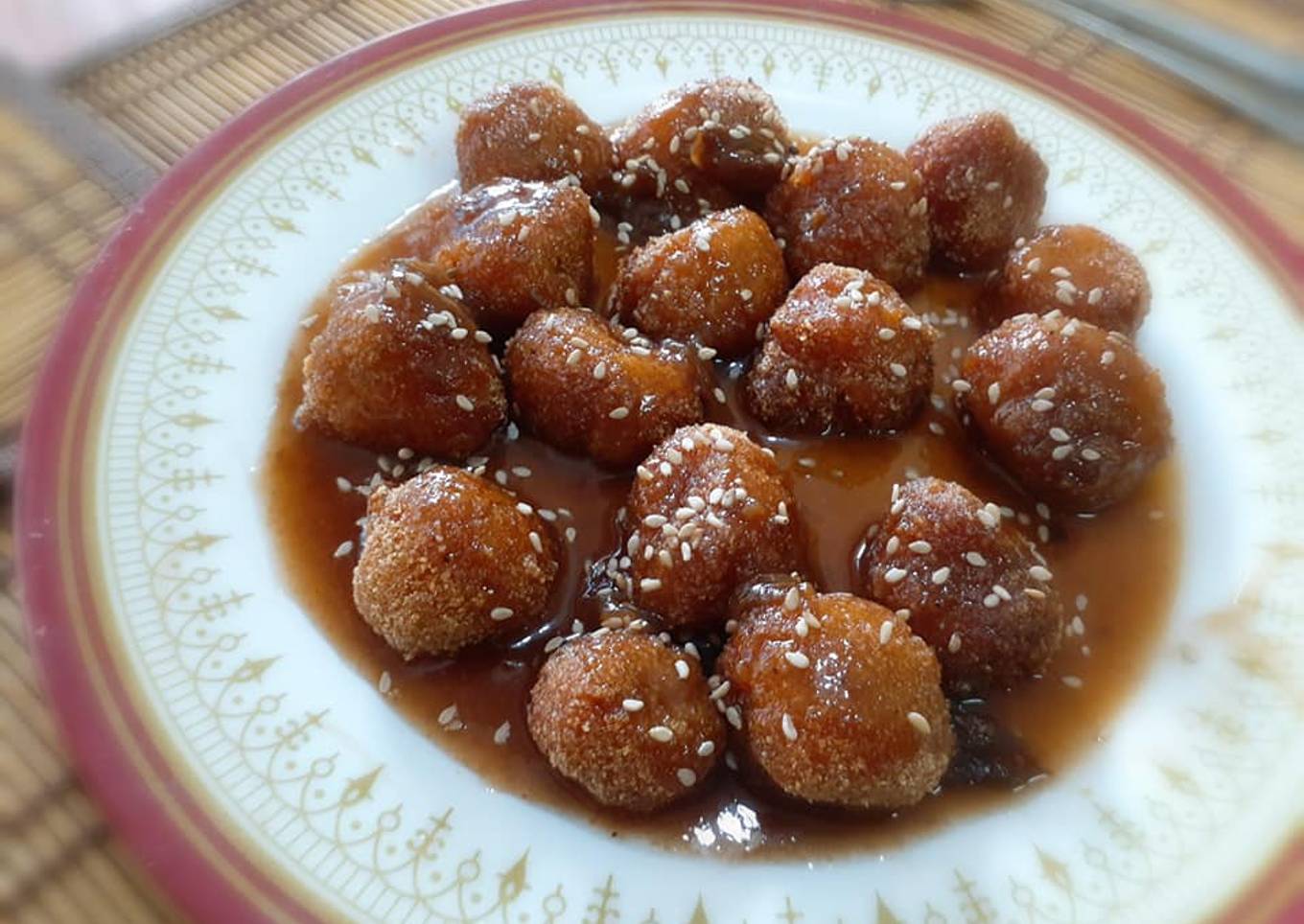 - Emplatamos las bombitas y luego las bañamos con la salsa y colocamos ajonjolí tostado encima.