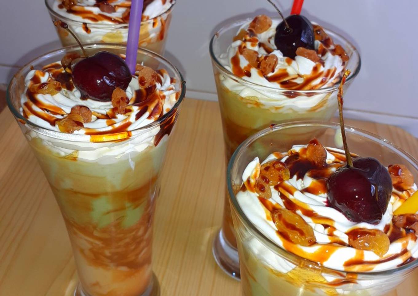 - La tercera capa: chantilly, pasas, caramelo, cereza.