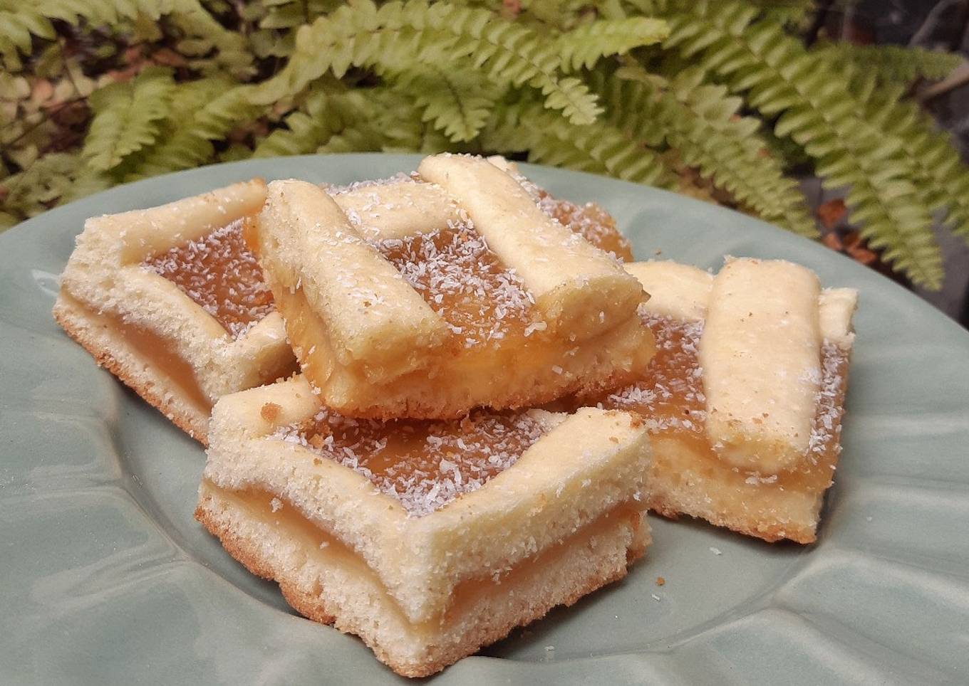 - Verter el dulce sobre la masa y con la masa restante hacer rollitos para cubrir la superficie y hacer el enrejado característico. Cocinar a horno medio durante 35 min o hasta que se doren los bordes. Dejar enfriar y espolvorear con coco rallado, lista para ser disfrutada🥰