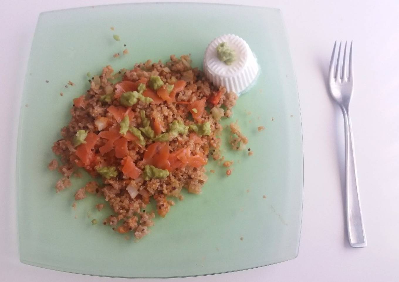 - Echar en el plato, trocear el salmón y añadirlo junto a lo demás y trocear también aguacate o si se prefiere guacamole echar un poco por encima de la quinoa. Añadir el quesito a un lado.