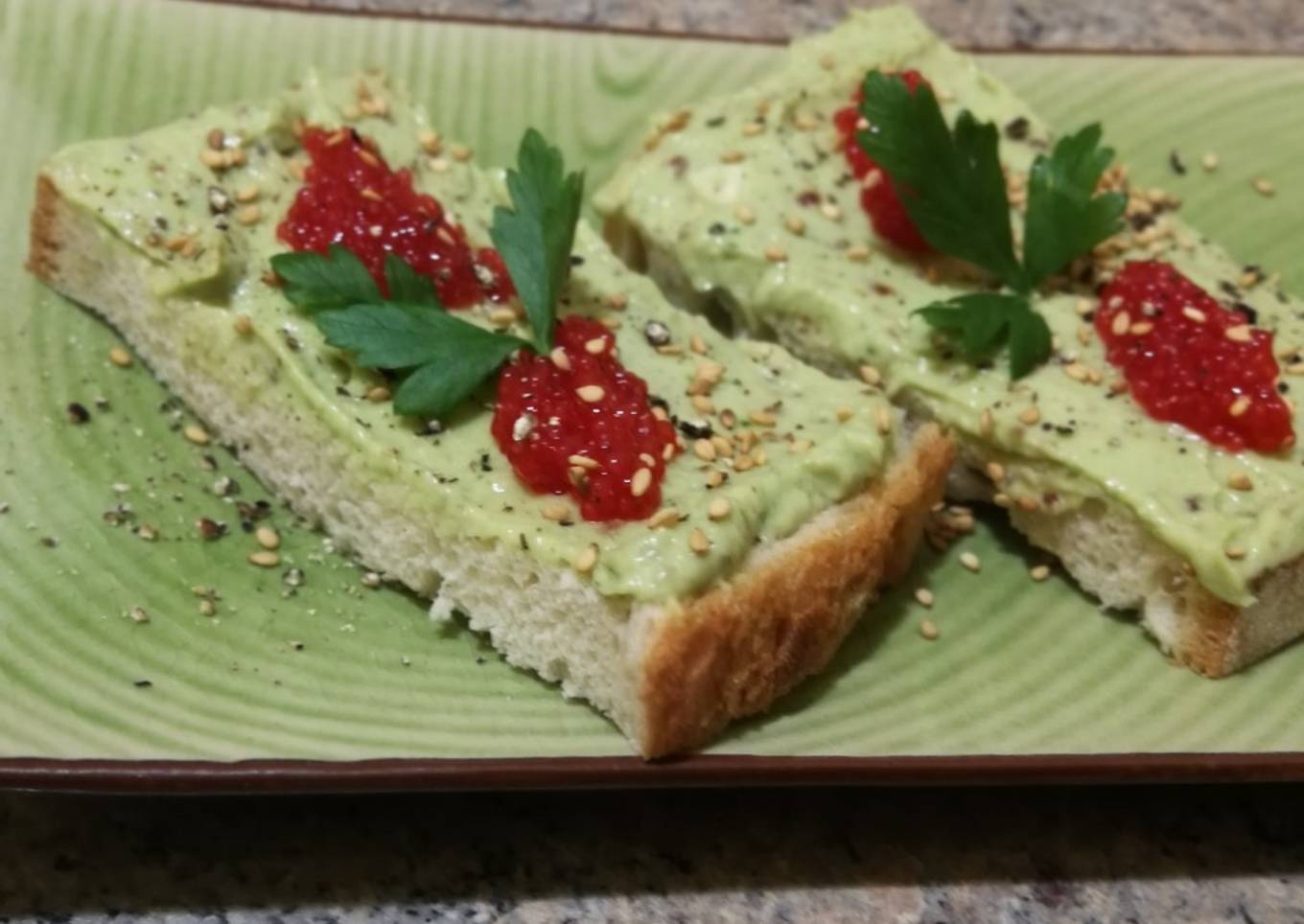 - Untar generosamente el pan con el paté de aguacate. Decorar con huevas de salmón de Pujol, hojas de perejil fresco y moler granos de pimienta negra al momento y espolvorear por encima unas semillas de sésamo tostado.